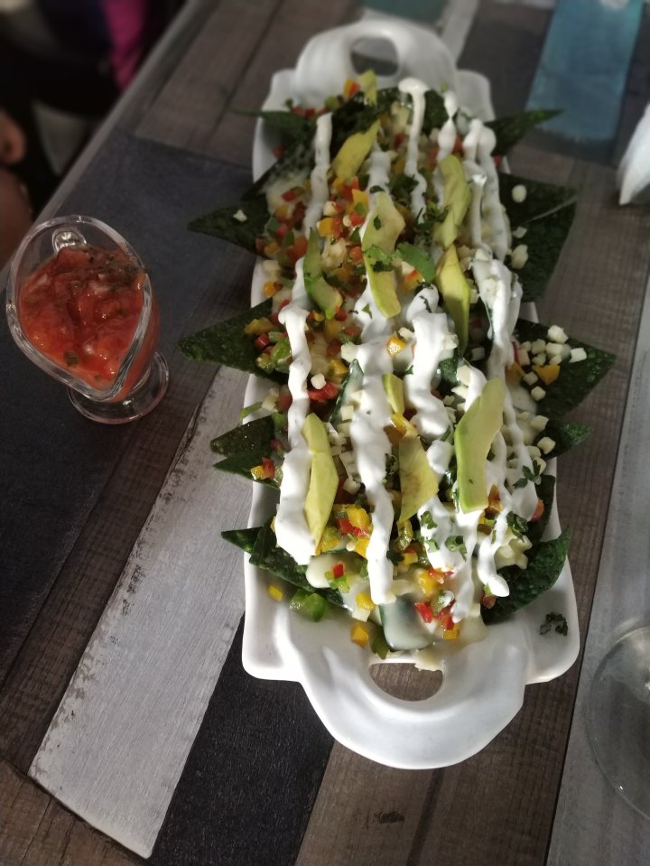 – Cuban Nachos (crisp tortilla tossed with beans, pico de gallo, cheese sauce, avocado, mojo, served with tomato salsa) :