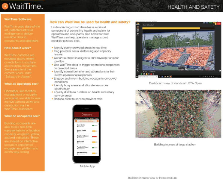 ZK: WaitTime is an innovative Solution which enhances the Stadium experience for Sports fans. It uses Crowd Intelligence along with patented artificial intelligence which deliver real-time data to help fans make smart decision. A real-time traffic system of interior environment. Shorter Wait, Better Experience.