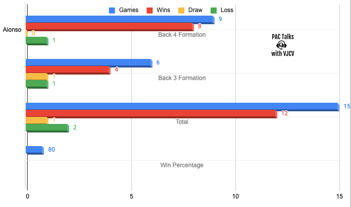 Alonso started in 15 games, 9 in a back 4 formation and 6 in a back 3 formation. Chelsea won 12 of these games. He also scored 4 crucial goals.