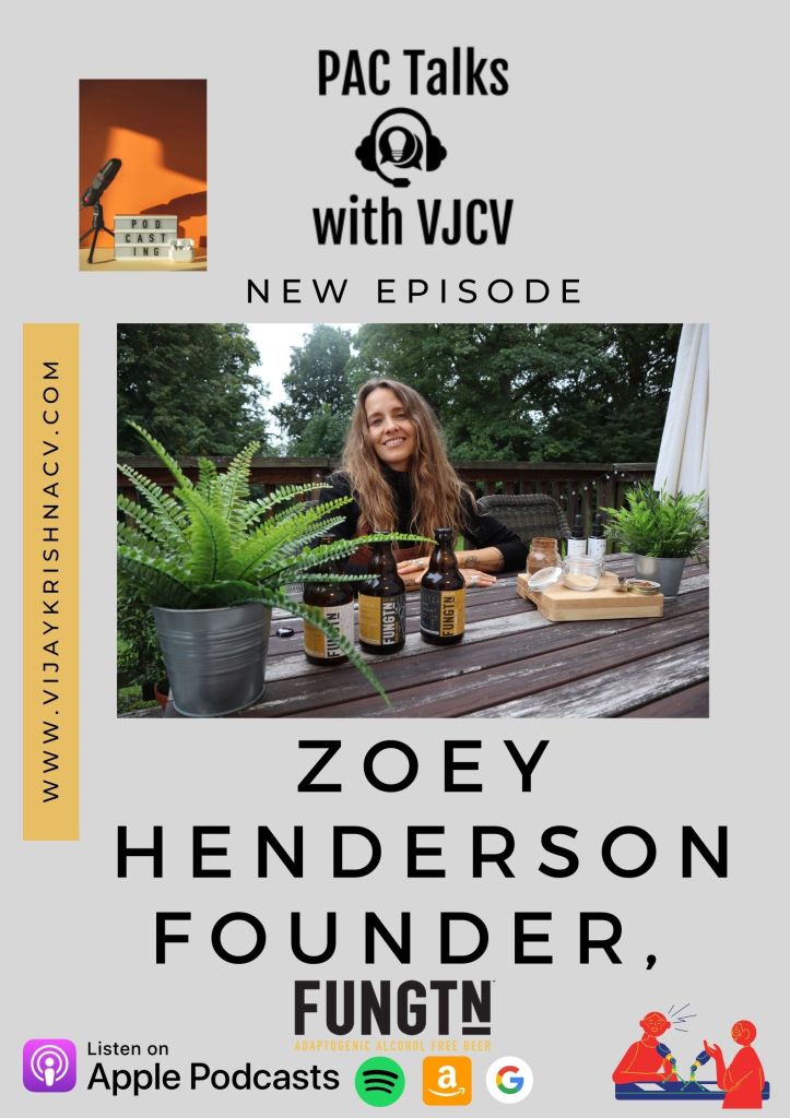 You can listen to this interesting conversation with Zoey where she spoke about the changing drinking habits of people across different global markets, Positive Wellness, Mindful Drinking, No-Lo Alcohol category, how big brands will help the overall growth of this segment, functional benefits of mushroom beer, the current and future plans of Fungtn and a lot more in my podcast (PAC Talks with VJCV) on Apple, Spotify , YouTube.