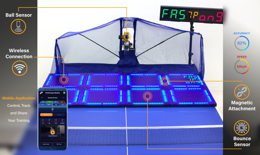 FastPong is a patented high tech table tennis training system that combines custom hardware and software. It is designed to provide more effective training for players of all levels. Multiple bright dynamic targets (effective in improving speed, accuracy and decision making in sports training) give visual feedback showing where the ball hits and data is collected via Bluetooth on the mobile app, for real-time metrics and historical analysis. Users can record and analyse their training history, progress and performance.