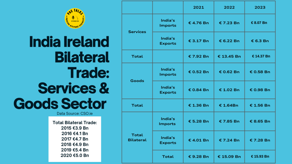 A look at the revised numbers published by the Central Statistics Office of Ireland indicates that the exports and imports of services between Ireland and India in 2022 was at € 13.4 Billion (€7.2 Billion exports to India and €6.2 Billion imports from India). In 2020, the figures were at €4.7 Billion and 2021 witnessed a trade of €7.9 Billion. The CSO initial report of 2023 shows that the trade is at €14.37 Billion.