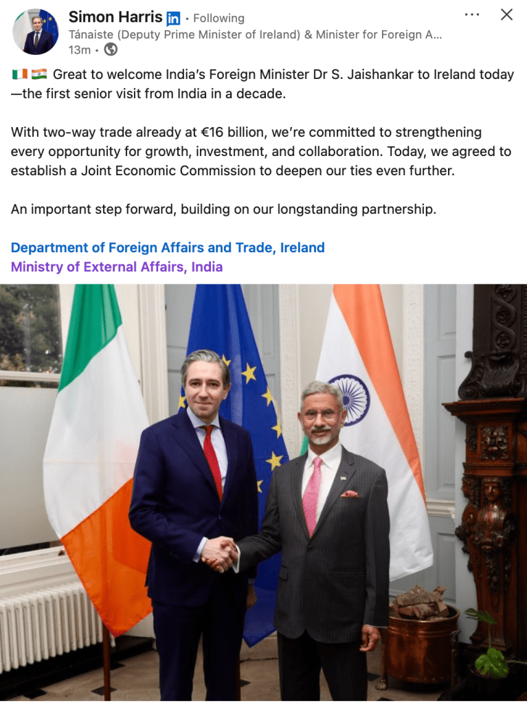 Ireland had an Asia Pacific 2020-2025 strategy with a focus on reaching €100 Billion annually in the two way trade. This was achieved in 2023, two years before the targeted time frame. The main markets were China, Japan, Singapore, etc. Though India was mentioned in the strategy document , the expected contributions were not much. However, things have started to change in the last two years and hope to see discussions and strategies around India Ireland trade getting more impetus.