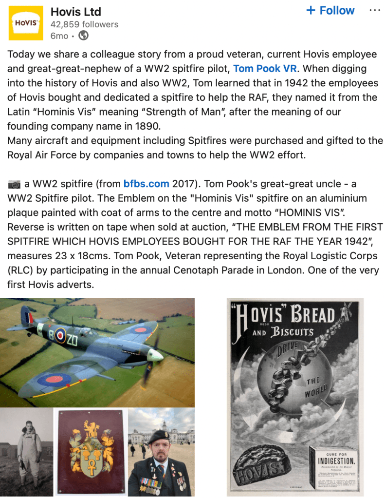 The manufacturing unit had to be moved to a bigger place to match the rising demand. In 1904 the milling moved to Trafford Park, Manchester. With the onset of automobiles, by 1912 the horses and carts which were used for delivery were replaced by petrol driven trucks. The 1920s witnessed the launch of first recipe books from Hovis, in 1930s tea with Hovis was seen everywhere , courtesy the tie up with pubs, hotels and tea shops across UK. The World War II Battle of Britain saw ‘Hominis Vis’ in the air, the spitfire provided by the employees of Hovis. In a recent Linkedin post by Hovis they mentioned an anecdote connecting the generations.